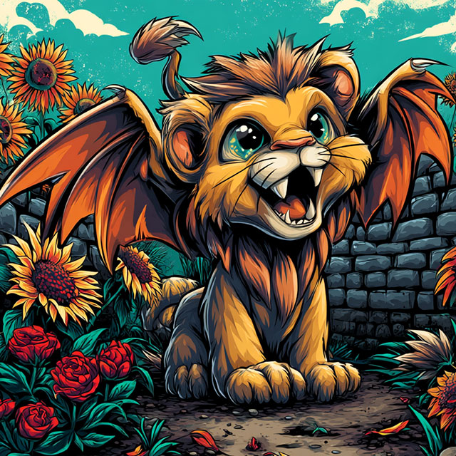 Allow us to introduce the Menagerie’s most enthusiastically hybrid, optimistically airborne, and perpetually mid-attempt resident: the Baby Manticore. Lion-bodied, bat-winged, scorpion-tailed, and possessed of a grin that suggests it is entirely comfortable with the fact that all of these things were assembled without a blueprint. It is wingin’ it. It has always been wingin’ it. It has elevated wingin’ it to an art form.